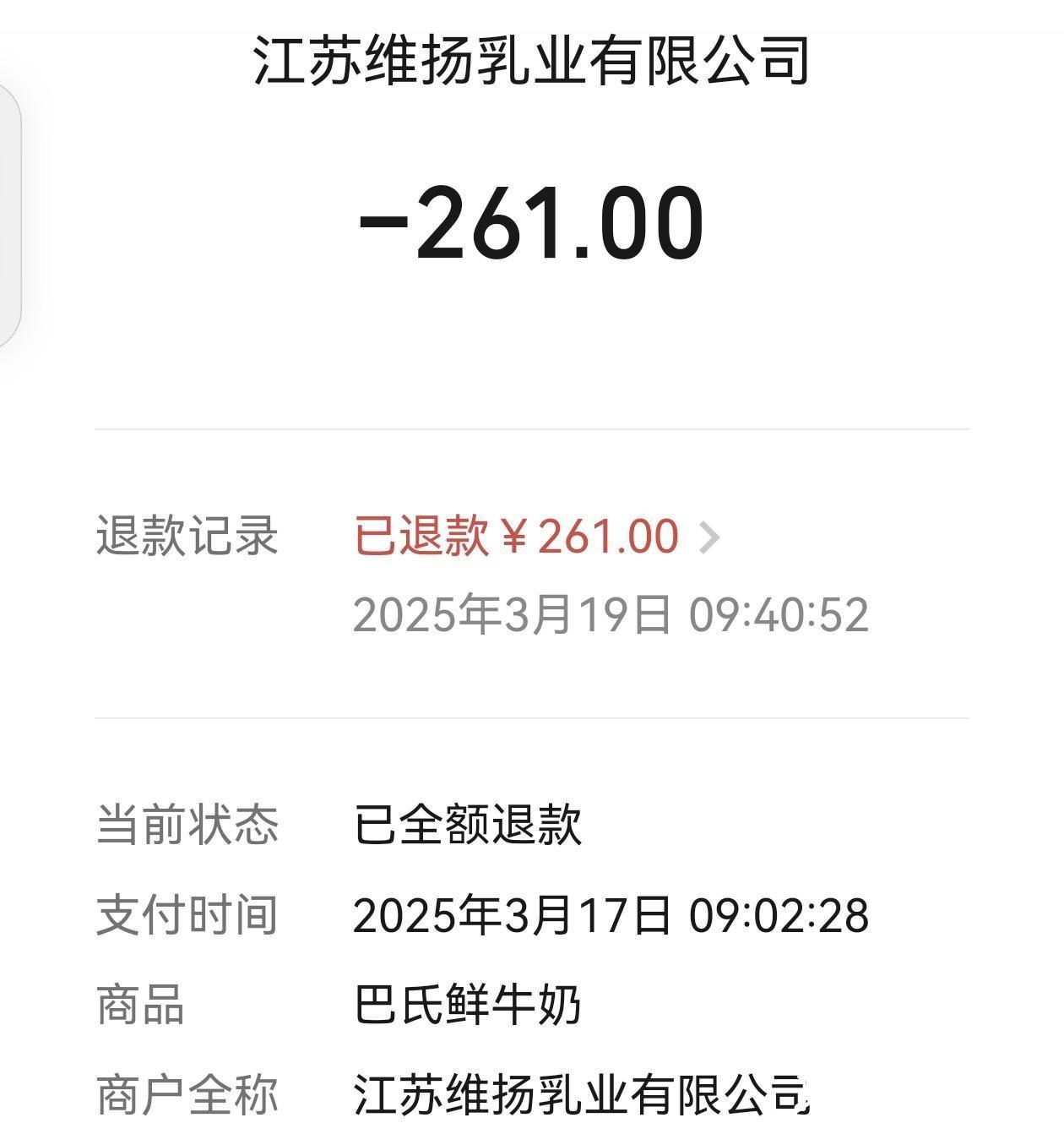 让尹先生没想到的是,维扬乳业停止了牛奶的配送,并在3月19日将第二笔订单的261元退到了尹先生的账户。对此,尹先生觉得维扬乳业侵犯了他作为消费者的权益,“维扬乳业以在农村需要加价为由单方面退款,这种行为不符合双方最初的合同约定。”